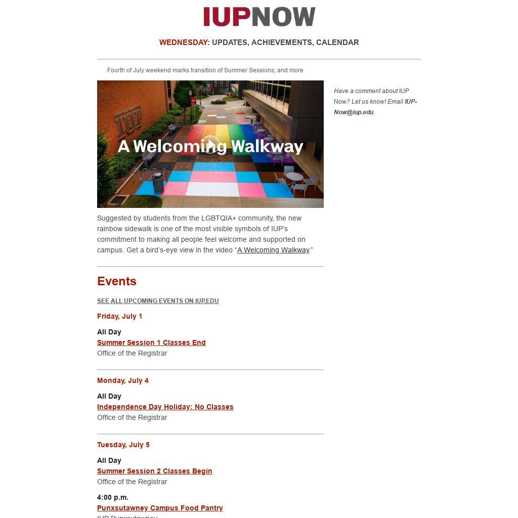 Summer publication schedule: Wednesday: University News, For Students and Advisors, For Employees, Achievements, Calendar, and Bulletin Board (employees only). Deadline: Items must be submitted via the IUP website to the Digital Team by noon, two business days before publication. Learn more about the newsletter’s publication schedule.