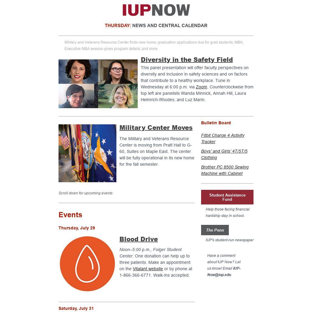 Distributed to IUP employees and students three days a week on its summer schedule, IUP Now is the official newsletter of Indiana University of Pennsylvania. It features news from across the IUP website, compiled by the Division of Marketing and Communications. Find out how to get your news and events in IUP Now.