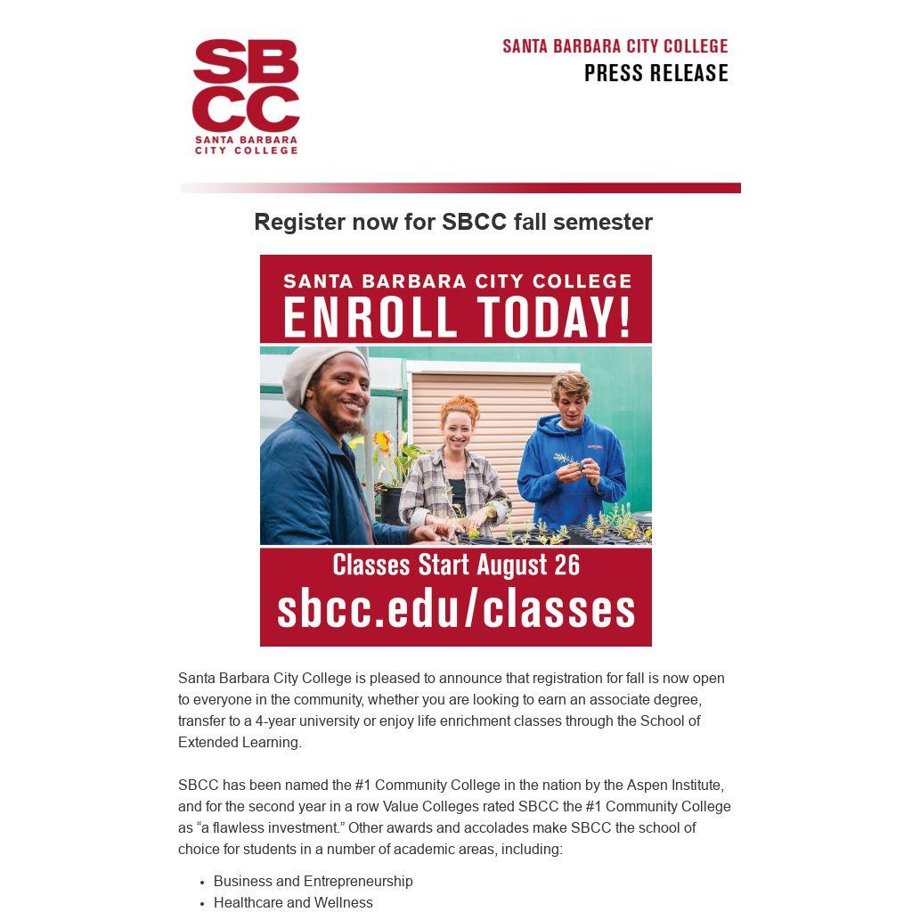 Santa Barbara City College is pleased to announce that registration for fall is now open to everyone in the community, whether you are looking to earn an associate degree, transfer to a 4-year university or enjoy life enrichment classes through the School of Extended Learning.