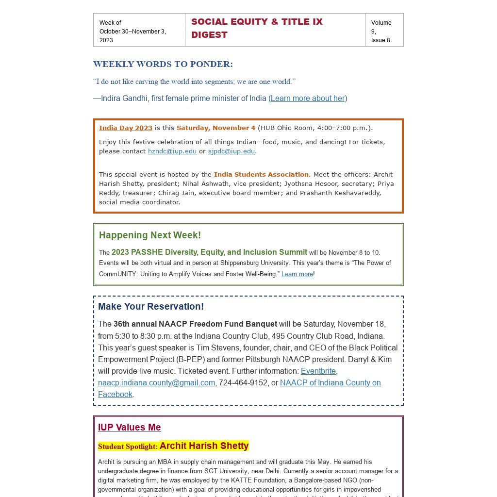 Digest issues are emailed every Monday morning. Send all information concerning your event to social-equity@iup.edu, and we will include it in the appropriate weekly issue. And, please be sure to enter your event in the CMS through the DIVERSITY, STUDENT, and CENTRAL CALENDARS so that it will receive wider marketing and achieve greater attendance.
