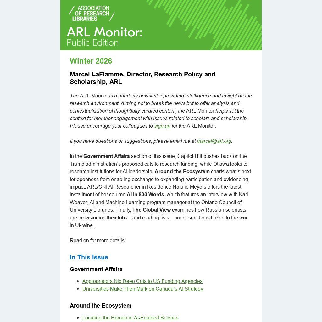 The ARL Monitor is a quarterly newsletter providing intelligence and insight on the research environment. Aiming not to break the news but to offer analysis and contextualization of thoughtfully curated content, the ARL Monitor helps set the context for member engagement with issues related to scholars and scholarship. Please encourage your colleagues to sign up for the ARL Monitor.