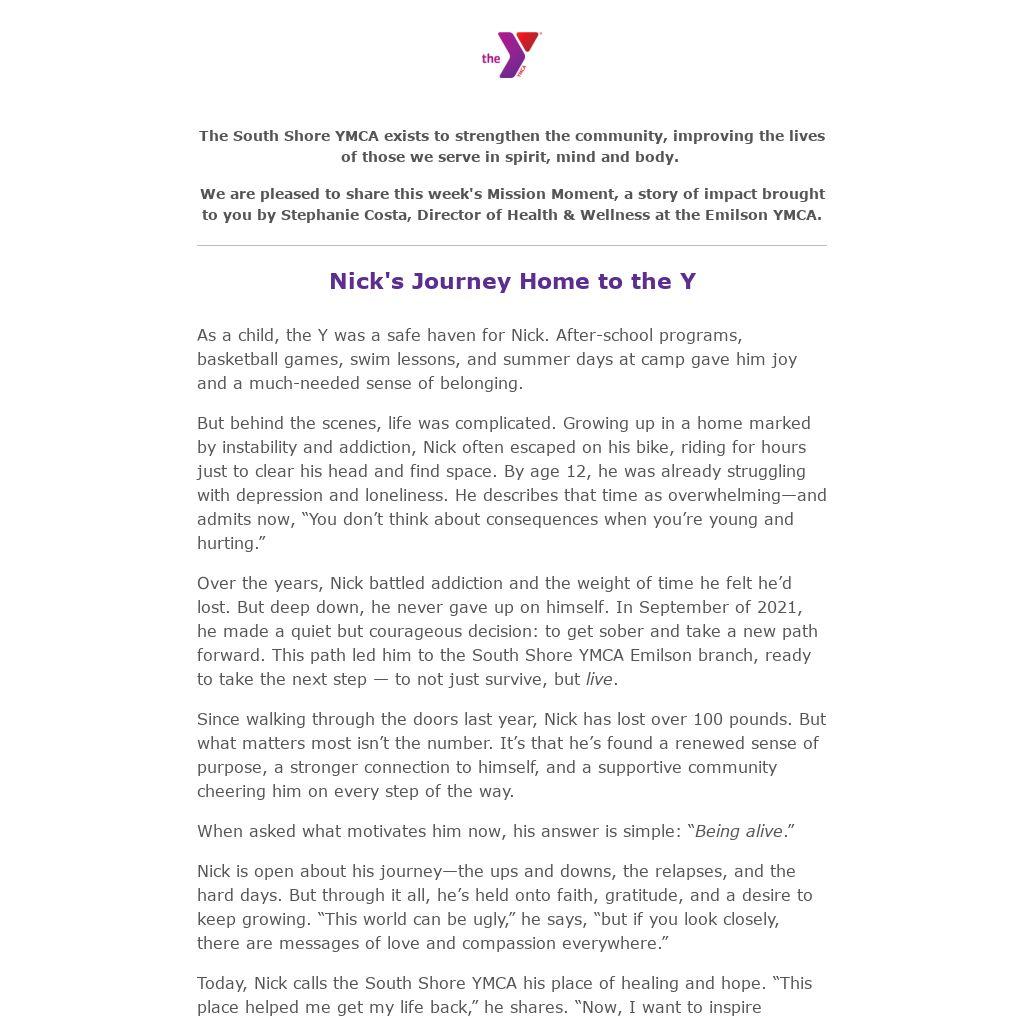 At the South Shore YMCA, our mission states that The Better You Belongs Here. And thanks to the support of our community, people like Nick find the strength to turn the page—and write a new chapter filled with hope.
