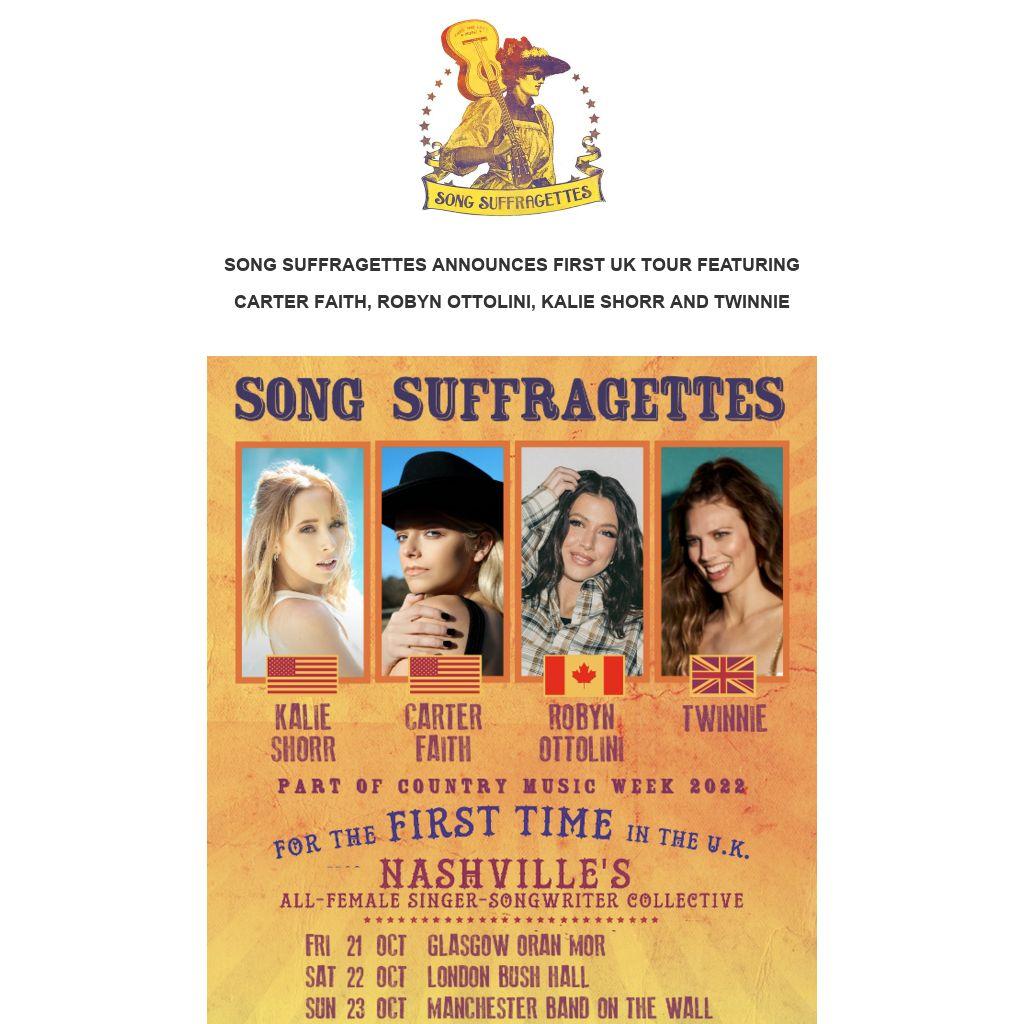 NASHVILLE, Tenn. (July 21, 2022) – Nashville’s acclaimed all-female singer-songwriter collective Song Suffragettes will embark on its first-ever international tour this October, featuring artists Carter Faith and Kalie Shorr from the United States, Robyn Ottolini from Canada, and Twinnie from the United Kingdom. Tickets are on sale now and available at www.gigsandtours.com, www.axs.com and www.seetickets.com.
