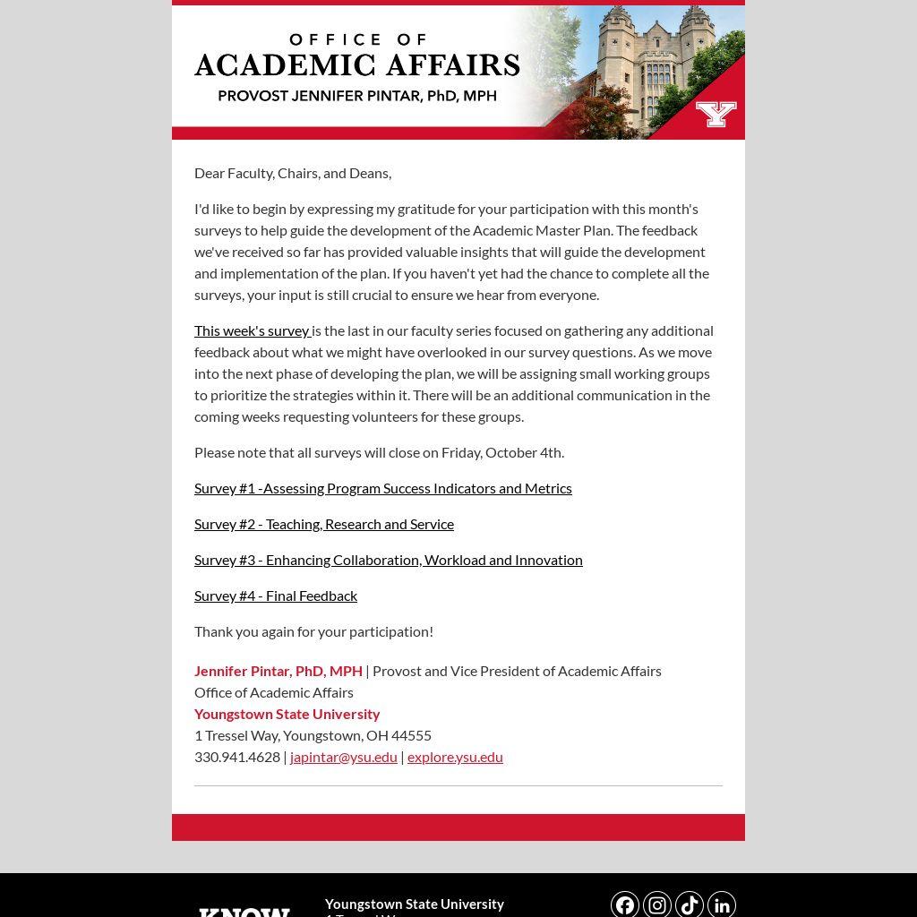 I'd like to begin by expressing my gratitude for your participation with this month's surveys to help guide the development of the Academic Master Plan. The feedback we've received so far has provided valuable insights that will guide the development and implementation of the plan. If you haven't yet had the chance to complete all the surveys, your input is still crucial to ensure we hear from everyone.