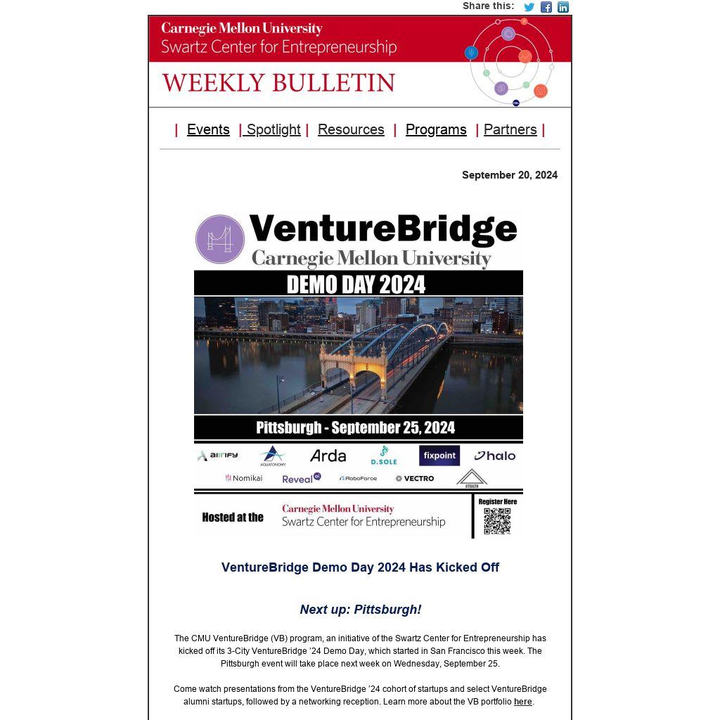 The CMU VentureBridge (VB) program, an initiative of the Swartz Center for Entrepreneurship has kicked off its 3-City VentureBridge ’24 Demo Day, which started in San Francisco this week. The Pittsburgh event will take place next week on Wednesday, September 25.