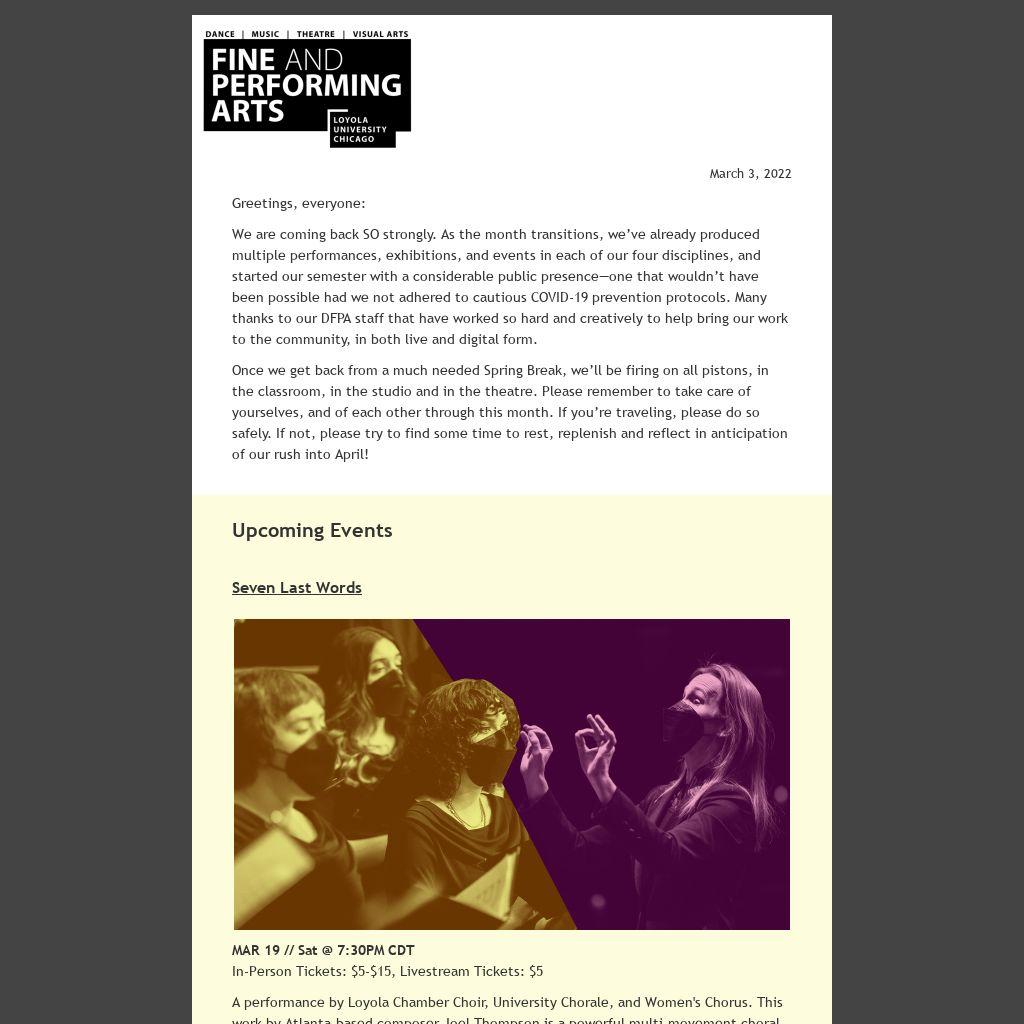 You and your students are our story, and we want to partner with you to share the activities of this unique arts community with others at Loyola and beyond through our websites, social media channels, and more.