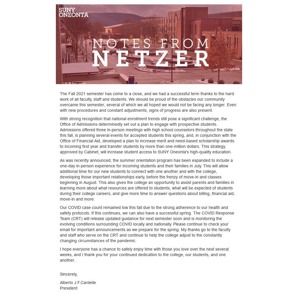 I hope everyone has a chance to safely enjoy time with those you love over the next several weeks, and I thank you for your continued dedication to the college, our students, and one another.
