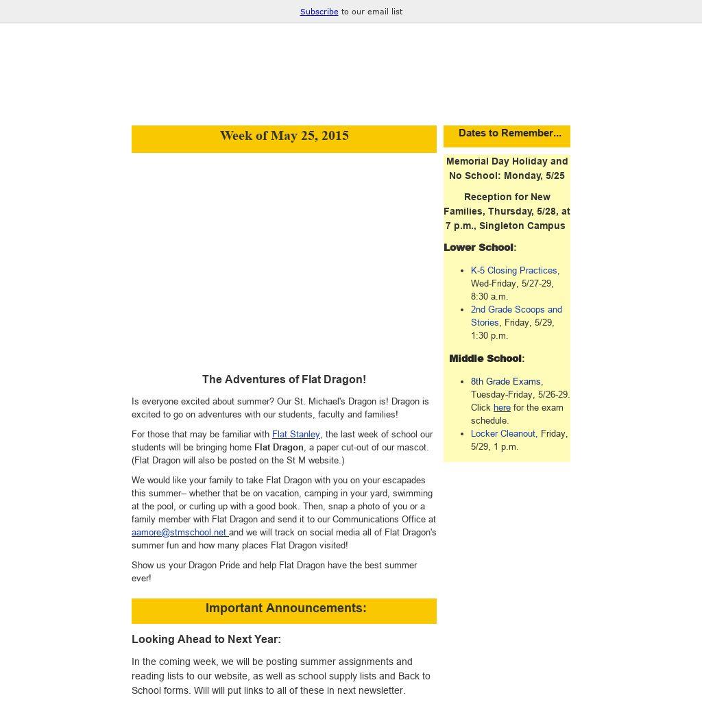 For those that may be familiar with Flat Stanley, the last week of school our students will be bringing home Flat Dragon, a paper cut-out of our mascot. (Flat Dragon will also be posted on the St M website.)