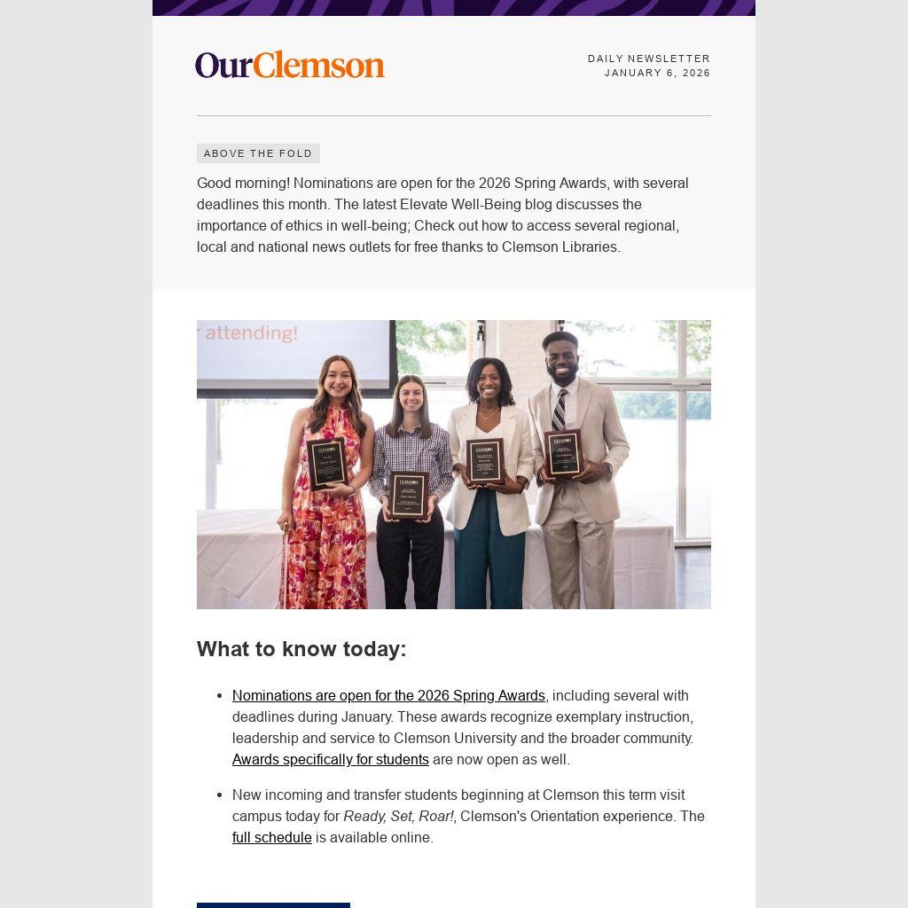 Good morning! Nominations are open for the 2026 Spring Awards, with several deadlines this month. The latest Elevate Well-Being blog discusses the importance of ethics in well-being; Check out how to access several regional, local and national news outlets for free thanks to Clemson Libraries.