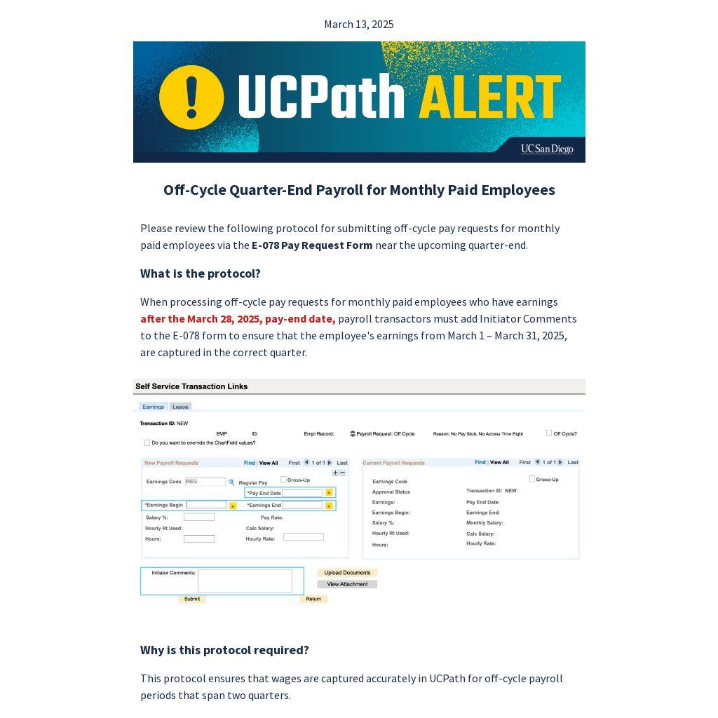 When processing off-cycle pay requests for monthly paid employees who have earnings after the March 28, 2025, pay-end date, payroll transactors must add Initiator Comments to the E-078 form to ensure that the employee's earnings from March 1 – March 31, 2025, are captured in the correct quarter.