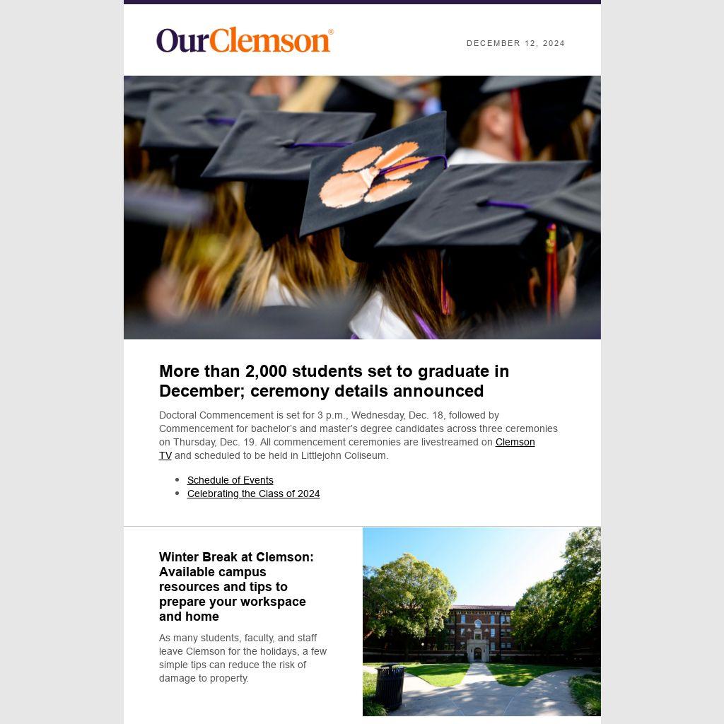 Doctoral Commencement is set for 3 p.m., Wednesday, Dec. 18, followed by Commencement for bachelor’s and master’s degree candidates across three ceremonies on Thursday, Dec. 19. All commencement ceremonies are livestreamed on Clemson TV and scheduled to be held in Littlejohn Coliseum.