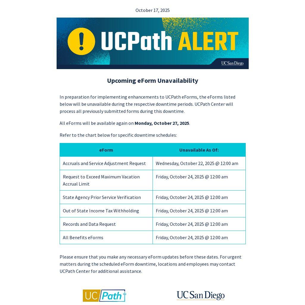 Please ensure that you make any necessary eForm updates before these dates. For urgent matters during the scheduled eForm downtime, locations and employees may contact UCPath Center for additional assistance.