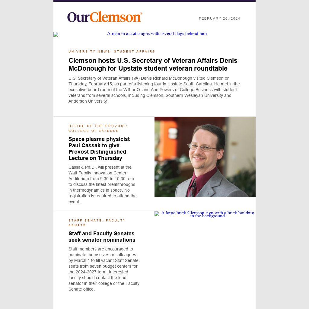 U.S. Secretary of Veteran Affairs (VA) Denis Richard McDonough visited Clemson on Thursday, February 15, as part of a listening tour in Upstate South Carolina. He met in the executive board room of the Wilbur O. and Ann Powers of College Business with student veterans from several schools, including Clemson, Southern Wesleyan University and Anderson University.