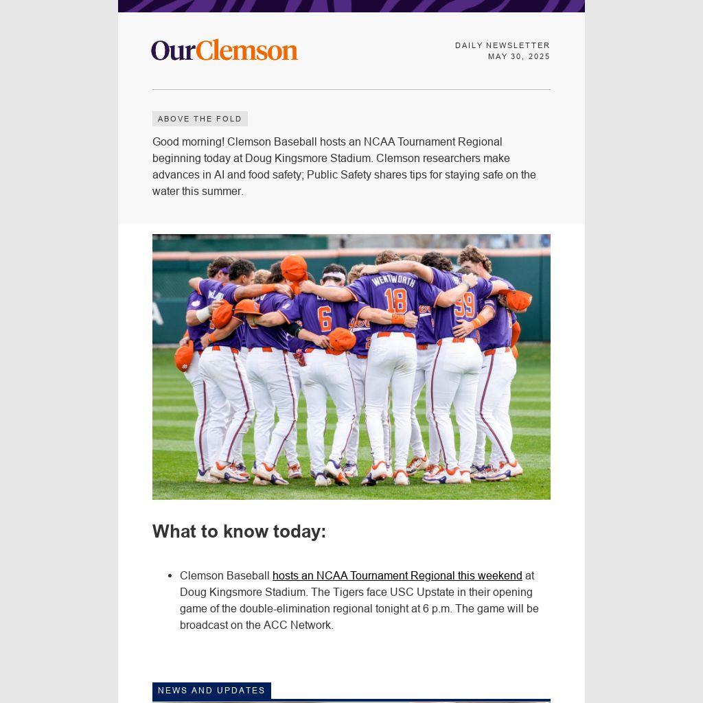 Good morning! Clemson Baseball hosts an NCAA Tournament Regional beginning today at Doug Kingsmore Stadium. Clemson researchers make advances in AI and food safety; Public Safety shares tips for staying safe on the water this summer.