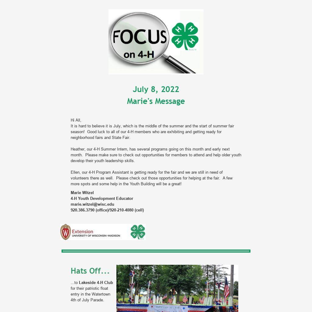 Hi All, It is hard to believe it is July, which is the middle of the summer and the start of summer fair season! Good luck to all of our 4-H members who are exhibiting and getting ready for neighborhood fairs and State Fair.