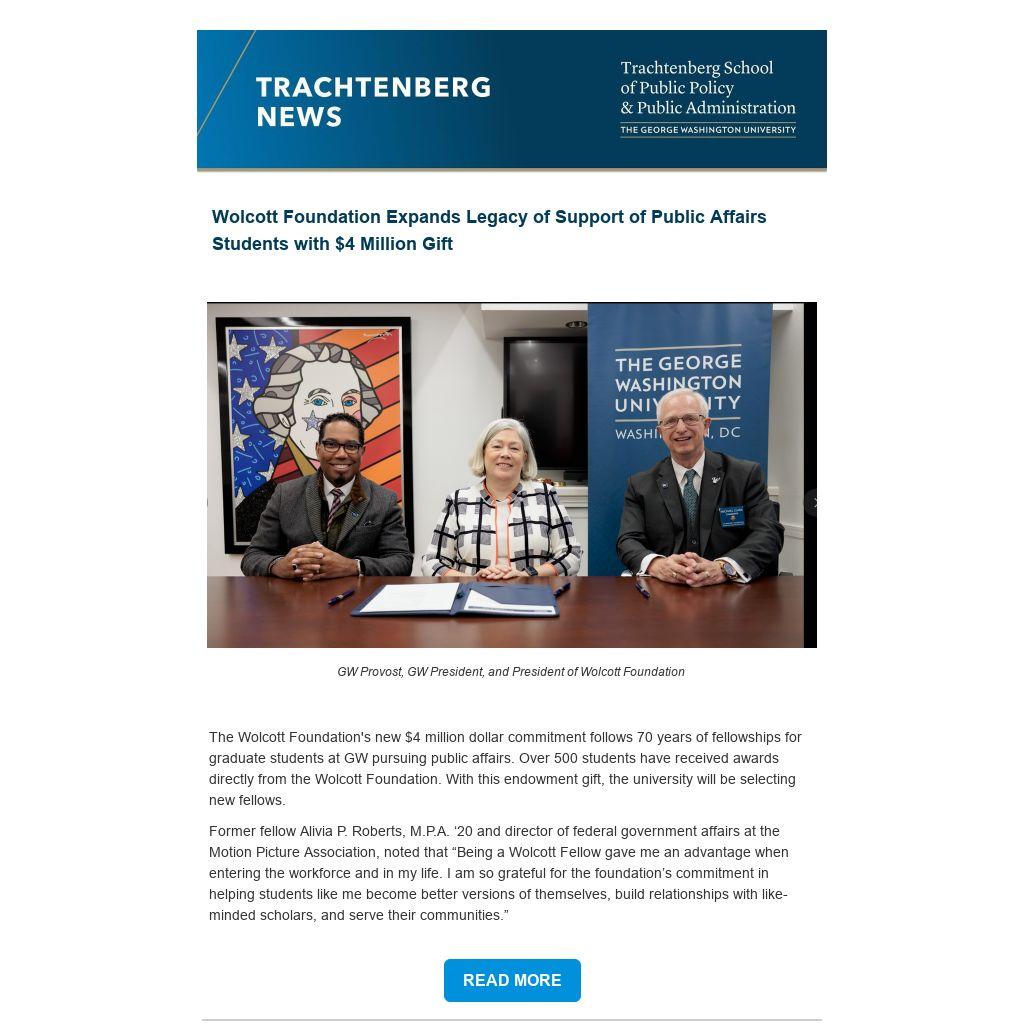 The Wolcott Foundation's new $4 million dollar commitment follows 70 years of fellowships for graduate students at GW pursuing public affairs. Over 500 students have received awards directly from the Wolcott Foundation. With this endowment gift, the university will be selecting new fellows.