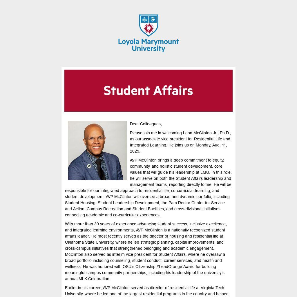 AVP McClinton brings a deep commitment to equity, community, and holistic student development, core values that will guide his leadership at LMU. In this role, he will serve on both the Student Affairs leadership and management teams, reporting directly to me. He will be responsible for our integrated approach to residential life, co-curricular learning, and student development. AVP McClinton will oversee a broad and dynamic portfolio, including Student Housing, Student Leadership Development, the Pam Rector Center for Service and Action, Campus Recreation and Student Facilities, and cross-divisional initiatives connecting academic and co-curricular experiences.