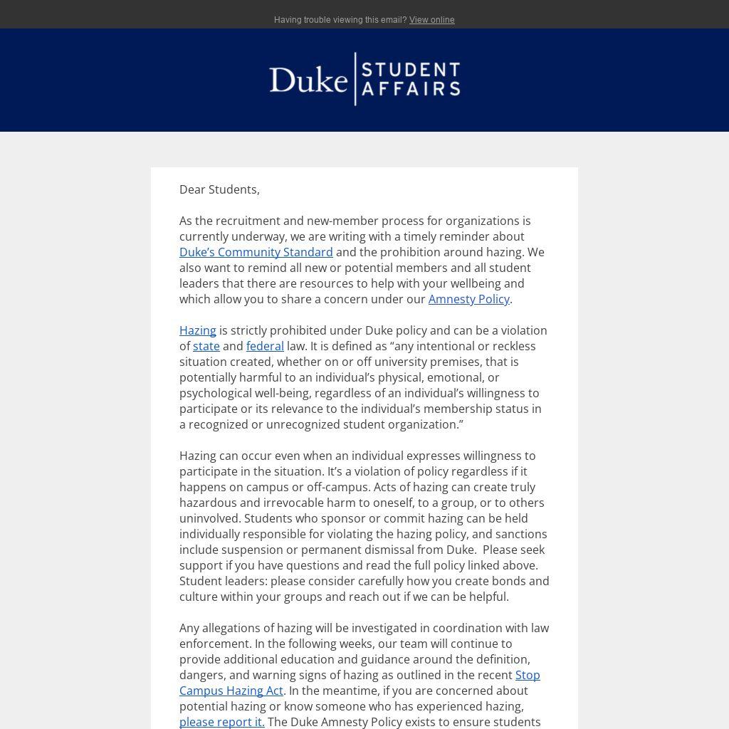 As the recruitment and new-member process for organizations is currently underway, we are writing with a timely reminder about Duke’s Community Standard and the prohibition around hazing. We also want to remind all new or potential members and all student leaders that there are resources to help with your wellbeing and which allow you to share a concern under our Amnesty Policy.