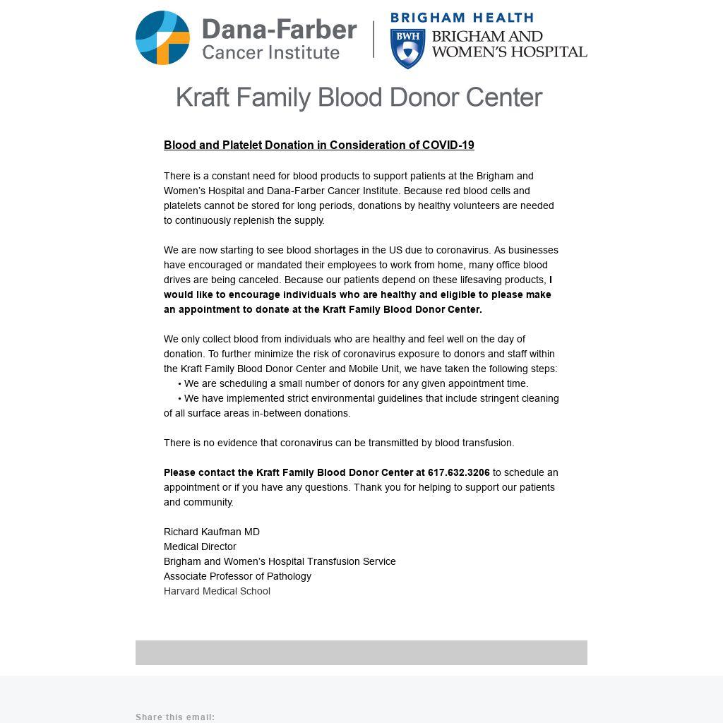 We are now starting to see blood shortages in the US due to coronavirus. As businesses have encouraged or mandated their employees to work from home, many office blood drives are being canceled. Because our patients depend on these lifesaving products, I would like to encourage individuals who are healthy and eligible to please make an appointment to donate at the Kraft Family Blood Donor Center.