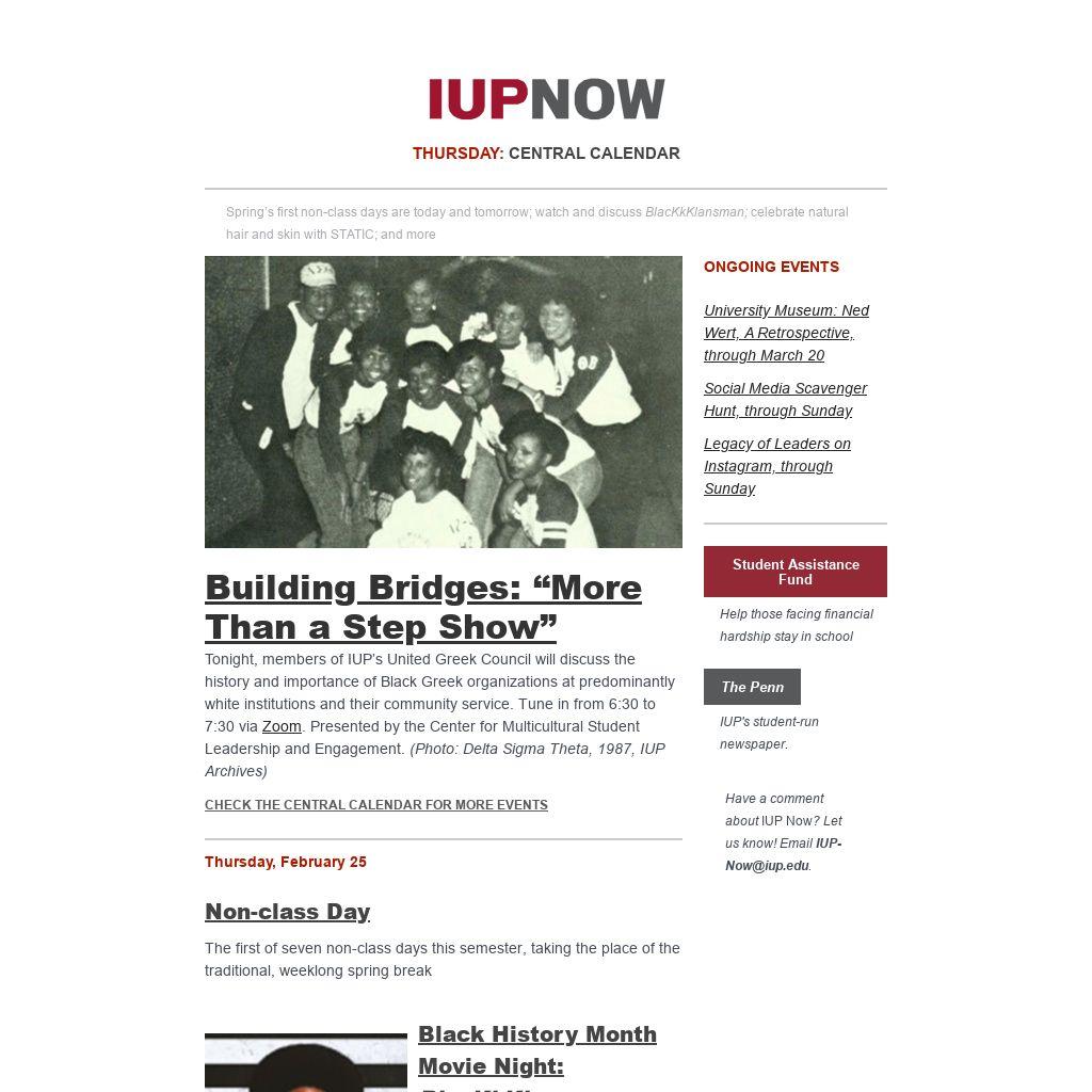 Distributed to IUP employees and students four days a week, IUP Now is the official newsletter of Indiana University of Pennsylvania. It features news from across the IUP website, compiled by the Division of Marketing and Communications. Find out how to get your news and events in IUP Now.