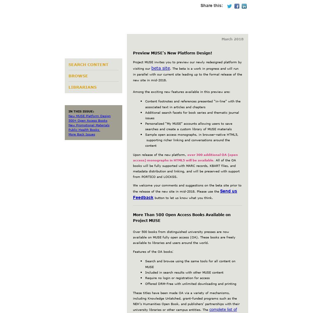 Features of the OA books: - Search and browse using the same tools for all content on MUSE