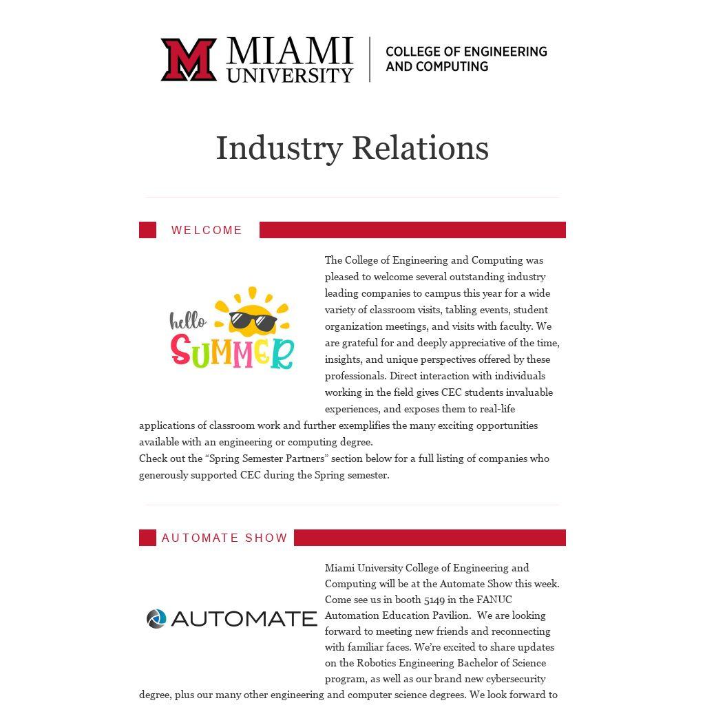 | #MoveInMiami: Thursday, August 24 Fall Semester Begins: Monday, August 28 Miami University Career Fair: Wednesday, September 27 Miami University STEM Career Fair: Thursday, September 28 CSE Industry Panel: Tuesday, October 3 Internship Panel: Wednesday, October 11 CEC 111 Career Exploration Panel: Monday, October 30 and Tuesday, October 31 Finals Week: December 11-15 Finals Week Study Break: Monday, December 11 Spring Semester Begins: January 29 Engineers Week: February 18-24 DEI Employer Showcase: Tuesday, February 20 Evening with Industry: Wednesday, April 17 SWE Girl Scout Day: Saturday, April 13 Senior Design Project Expo: Thursday, May 2 Alumni and Friends Conference: Friday, May 3 Finals Week Study Break: Monday, May 6