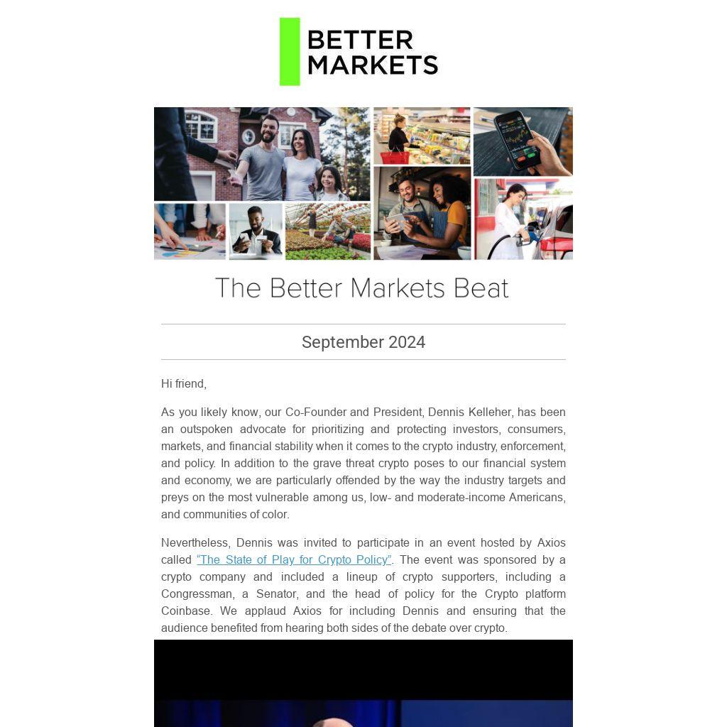 As you likely know, our Co-Founder and President, Dennis Kelleher, has been an outspoken advocate for prioritizing and protecting investors, consumers, markets, and financial stability when it comes to the crypto industry, enforcement, and policy. In addition to the grave threat crypto poses to our financial system and economy, we are particularly offended by the way the industry targets and preys on the most vulnerable among us, low- and moderate-income Americans, and communities of color.