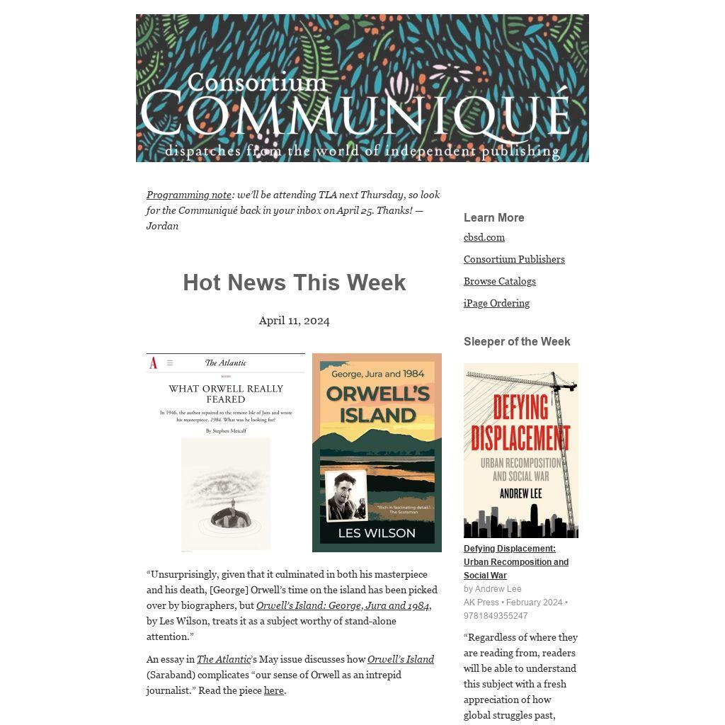 | Programming note: we’ll be attending TLA next Thursday, so look for the Communiqué back in your inbox on April 25. Thanks! —Jordan
