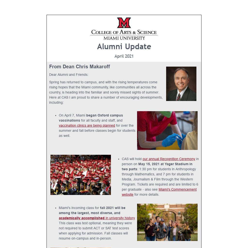 Spring has returned to campus, and with the rising temperatures come rising hopes that the Miami community, like communities all across the country, is heading into the familiar and sorely missed sights of summer. Here at CAS I am proud to share a number of encouraging developments, including: