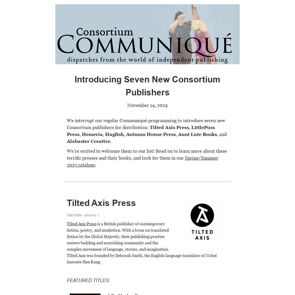 We interrupt our regular Communiqué programming to introduce seven new Consortium publishers for distribution: Tilted Axis Press, LittlePuss Press, Hemeria, Hagfish, Autumn House Press, Aunt Lute Books, and Alabaster Creative.