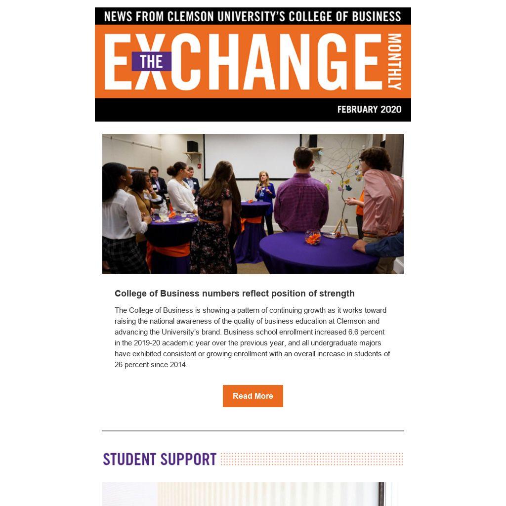 The College of Business is showing a pattern of continuing growth as it works toward raising the national awareness of the quality of business education at Clemson and advancing the University’s brand. Business school enrollment increased 6.6 percent in the 2019-20 academic year over the previous year, and all undergraduate majors have exhibited consistent or growing enrollment with an overall increase in students of 26 percent since 2014.