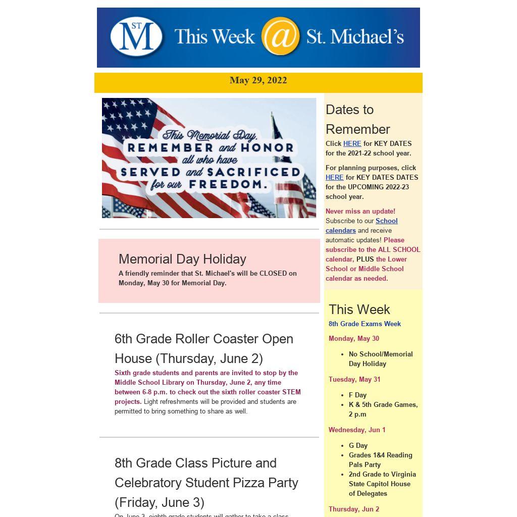 A friendly reminder that St. Michael's will be CLOSED on Monday, May 30 for Memorial Day.