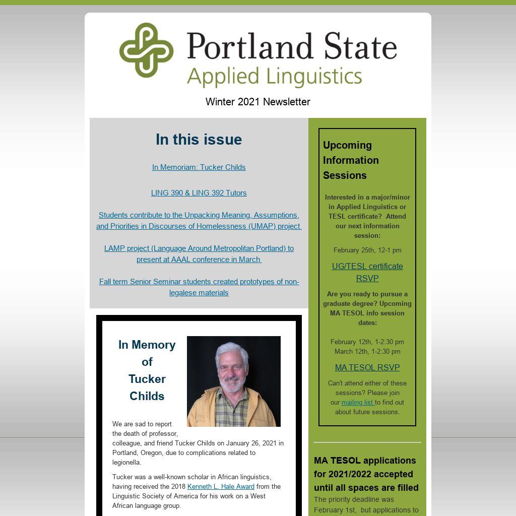 He had been in the PSU Department of Applied Linguistics for almost 25 years. Many students and alumni will remember his Phonetics and Phonology courses, among others, and his stalwart support of the department’s First Friday events at Hot Lips Pizza. Tucker’s attempts to project a curmudgeonly exterior were belied by the kindness he demonstrated to colleagues, students, and friends in so many ways. He will be sorely missed. Read a more complete memorial to Tucker here.