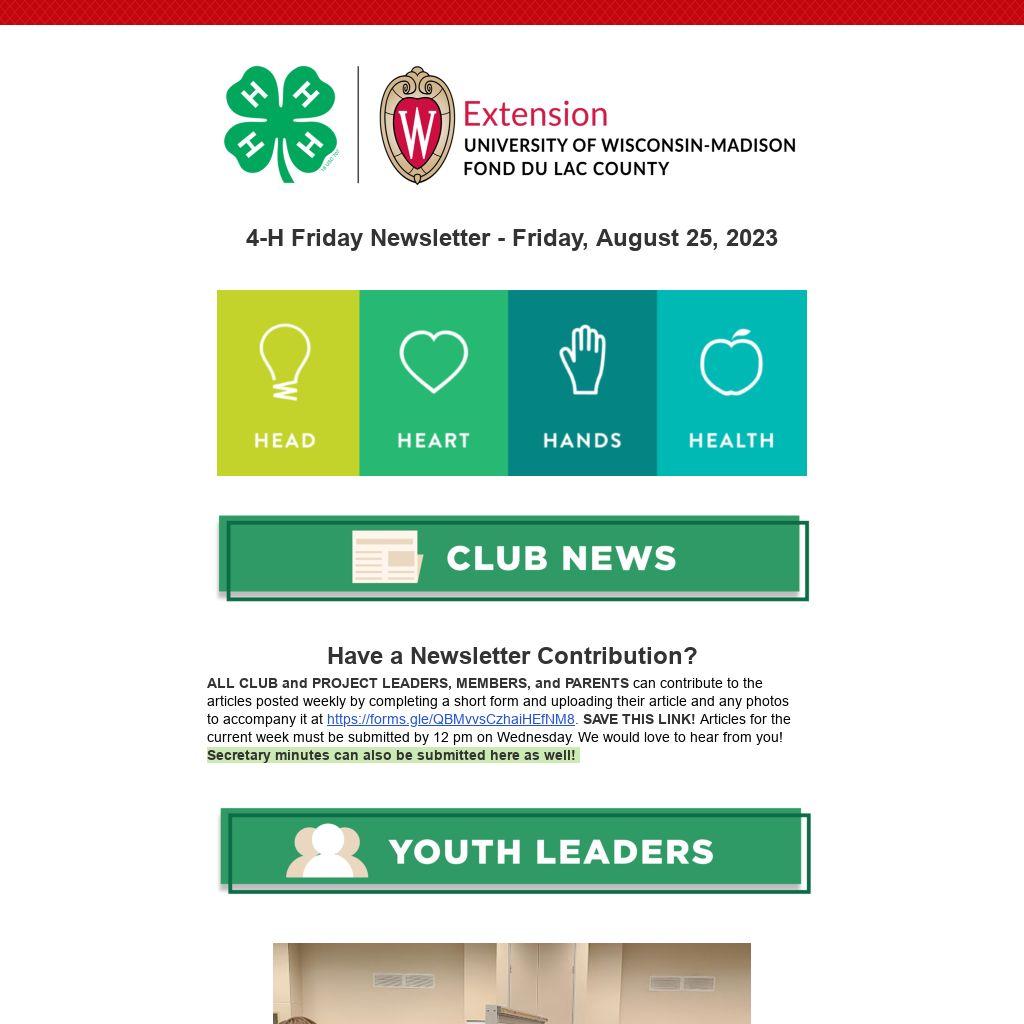 Adult Volunteer RecognitionIt is time to nominate 4-H volunteers and businesses to be recognized for their contributions. There are four categories: 1.) 4-H Alumni - given to an individual who, at one time, was a 4-H member and currently shows much support for the 4-H Program. Two to four (2-4) awards may be given annually. 2.) Meritorious Leader - given to an individual who was not a 4-H member; however currently shows much concern and responsibility as a 4-H Leader (i.e. not 4-H Alumni). One to two (1-2) awards may be given annually. 3.) Friend of 4-H - given to an individual, business, or group from the community that has shown much support for the 4-H Program in a variety of ways. One (1) award is given annually. 4.) 4-H Volunteer of the Year (less than 10 years of service) Lifetime Volunteer of the Year (10 or more years of service) - given to individuals who have done an outstanding job of volunteering. Here is a link to the application form: https://fonddulac.extension.wisc.edu/4h/ awards-scholarships/#volunteer. They are due September 1.