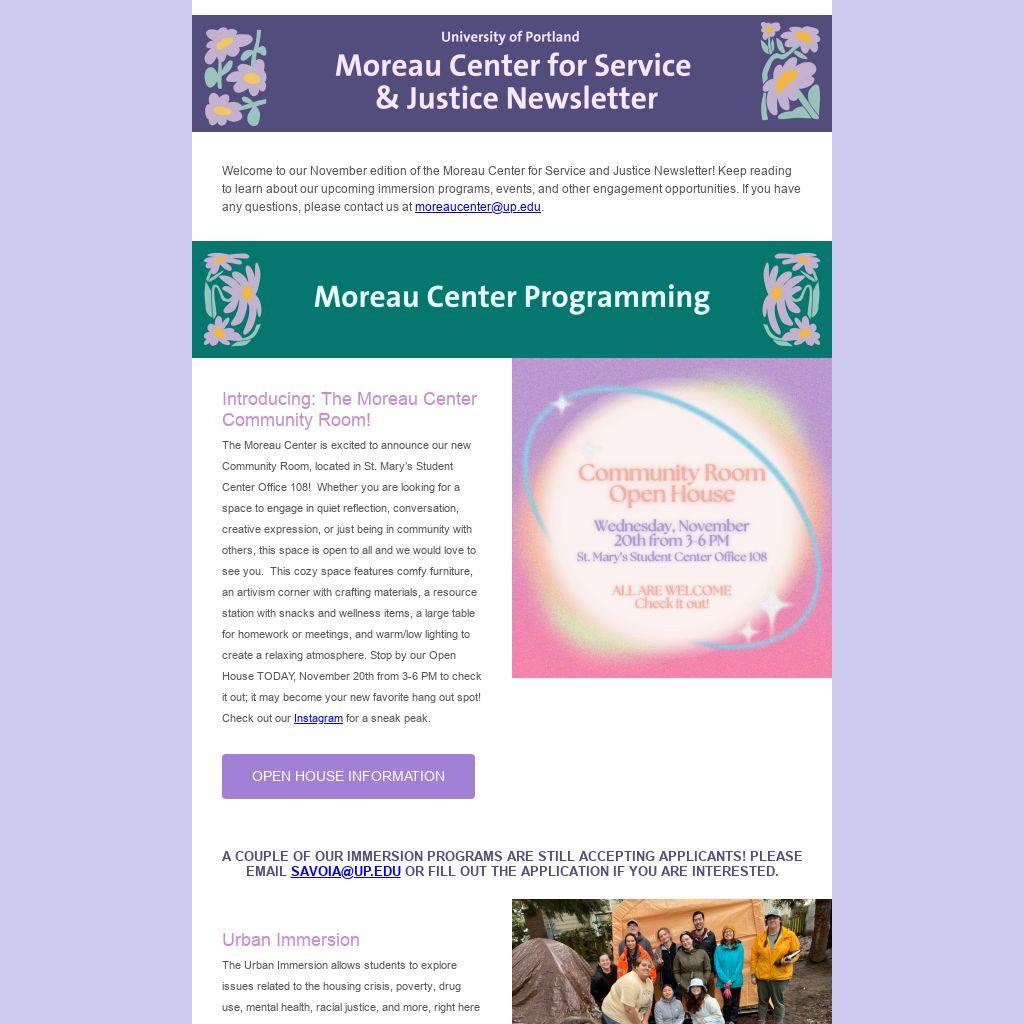 Welcome to our November edition of the Moreau Center for Service and Justice Newsletter! Keep reading to learn about our upcoming immersion programs, events, and other engagement opportunities. If you have any questions, please contact us at moreaucenter@up.edu.
