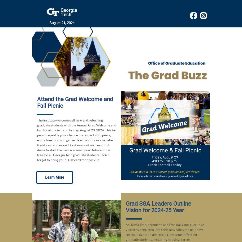 The Institute welcomes all new and returning graduate students with the Annual Grad Welcome and Fall Picnic. Join us on Friday, August 23, 2024. This in-person event is your chance to connect with peers, enjoy free food and games, learn about our cherished traditions, and more. Don't miss out on free spirit items to start the new academic year. Admission is free for all Georgia Tech graduate students. Don't forget to bring your Buzz card for check-in.