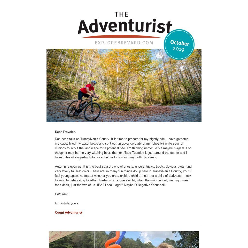 Autumn is upon us. It is the best season: one of ghosts, ghouls, tricks, treats, devious plots, and very lovely fall leaf color. There are so many fun things do up here in Transylvania County, you’ll feel young again, no matter whether you are a child, a child at heart, or a child of darkness. I look forward to celebrating together. Perhaps on a lonely night, when the moon is out, we might meet for a drink, just the two of us. IPA? Local Lager? Maybe O Negative? Your call.