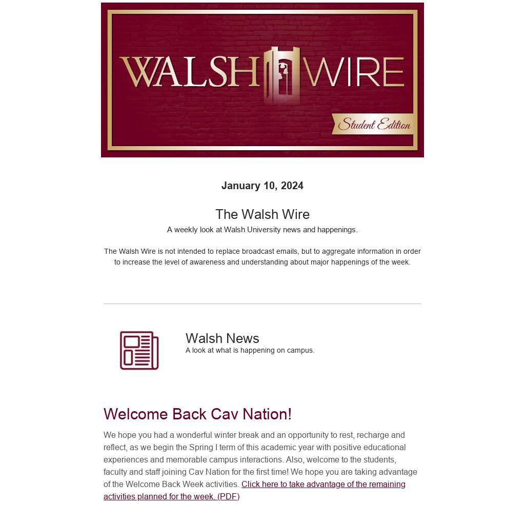 Students may continue to make registration changes during the add/drop periods defined within the Academic Calendar. As a reminder, the last day to add/drop a Full-Term or Spring I course and receive a refund is Friday, Jan. 12 by 12 p.m. You may make the schedule changes through the Cav Center, or by submitting the Request to Add a Course/Request to Drop a Course forms through Walsh E-Forms. Students, faculty, and staff can see real-time information regarding course availability through the Cav Center Class Schedule. This can be found within the Cav Center portal, or within the “Registration Home” module in your student profile. As a reminder, the Walsh University Bookstore will be open until 4 p.m., Wednesday through Friday, this week.