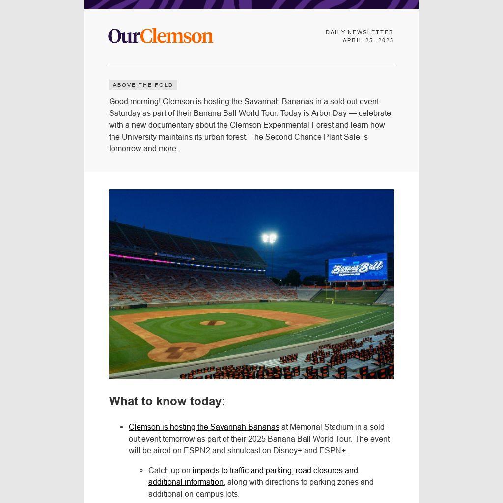 Good morning! Clemson is hosting the Savannah Bananas in a sold out event Saturday as part of their Banana Ball World Tour. Today is Arbor Day — celebrate with a new documentary about the Clemson Experimental Forest and learn how the University maintains its urban forest. The Second Chance Plant Sale is tomorrow and more.