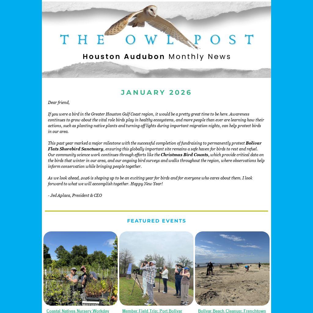This past year marked a major milestone with the successful completion of fundraising to permanently protect Bolivar Flats Shorebird Sanctuary, ensuring this globally important site remains a safe haven for birds to rest and refuel. Our community science work continues through efforts like the Christmas Bird Counts, which provide critical data on the birds that winter in our area, and our ongoing bird surveys and walks throughout the region, where observations help inform conservation while bringing people together.