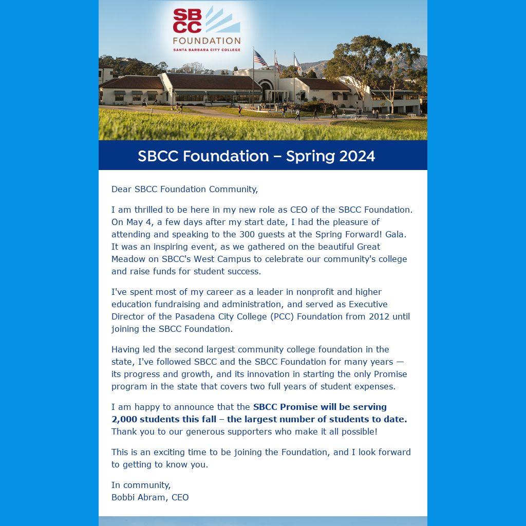 Having led the second largest community college foundation in the state, I've followed SBCC and the SBCC Foundation for many years — its progress and growth, and its innovation in starting the only Promise program in the state that covers two full years of student expenses.