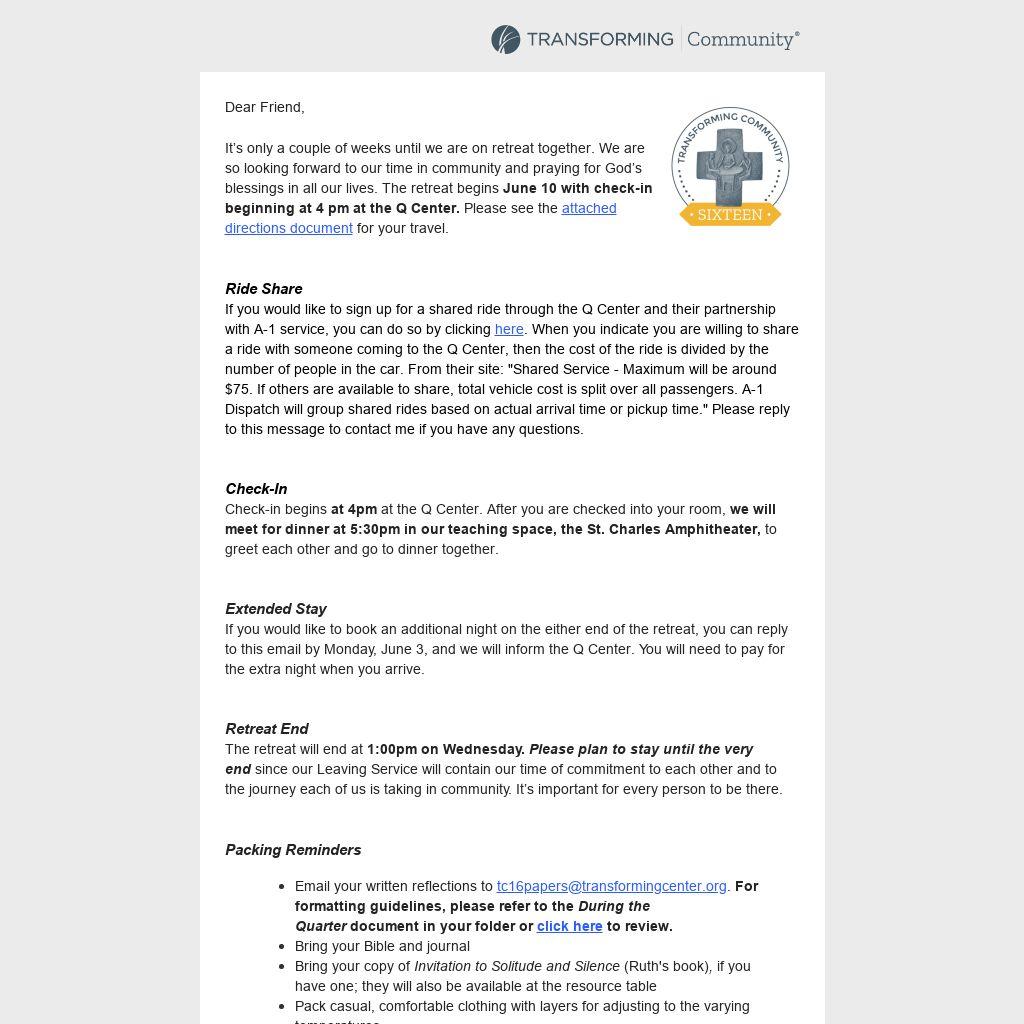 Remember, if you have to be absent for any retreat, email tc16@transformingcenter.org to let us know so we can be aware of the things going on for you and can hold you in prayer.