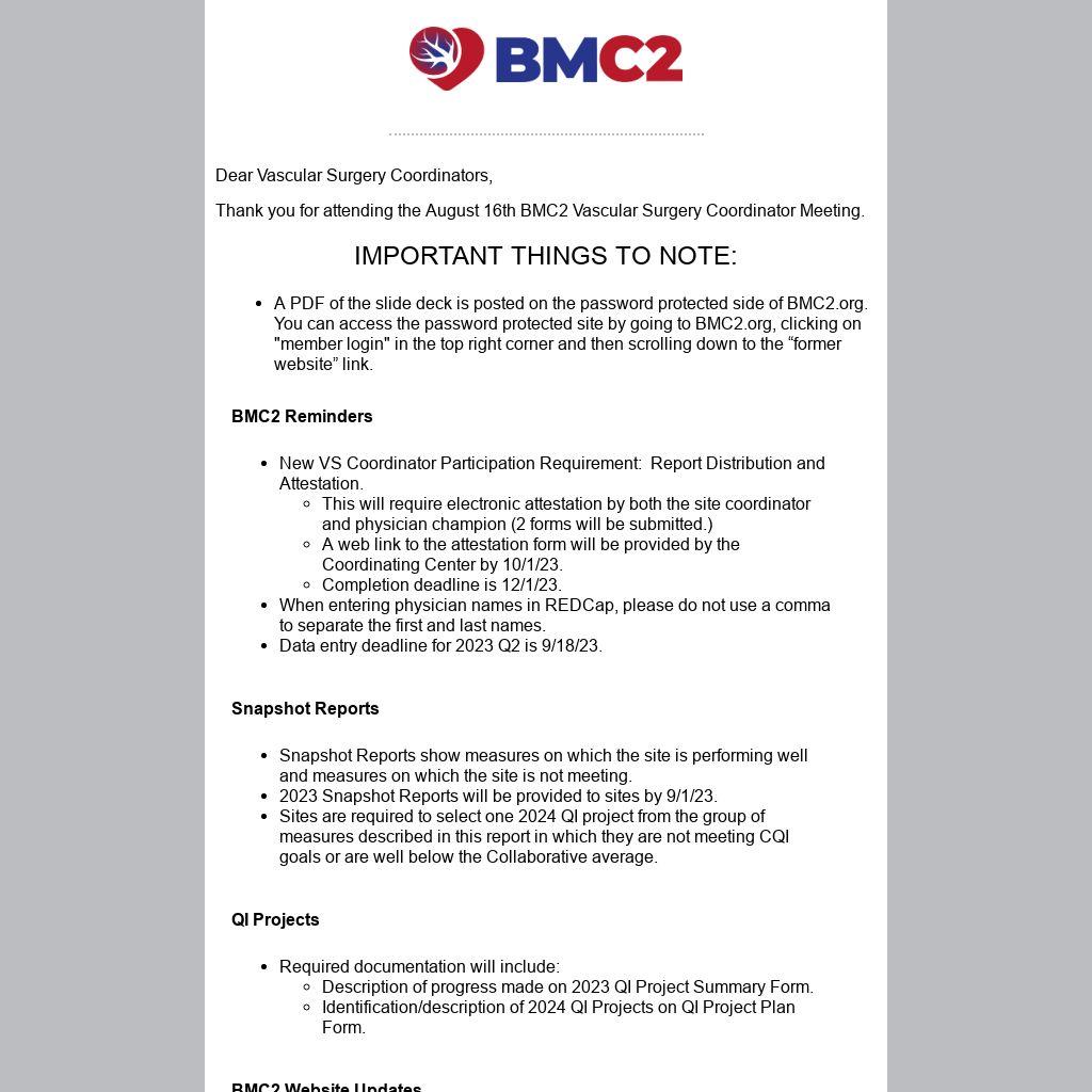 Thank you for attending the August 16th BMC2 Vascular Surgery Coordinator Meeting.