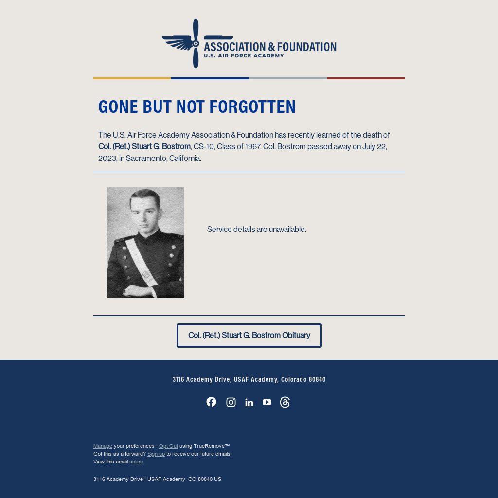 The U.S. Air Force Academy Association & Foundation has recently learned of the death of Col. (Ret.) Stuart G. Bostrom, CS-10, Class of 1967. Col. Bostrom passed away on July 22, 2023, in Sacramento, California.