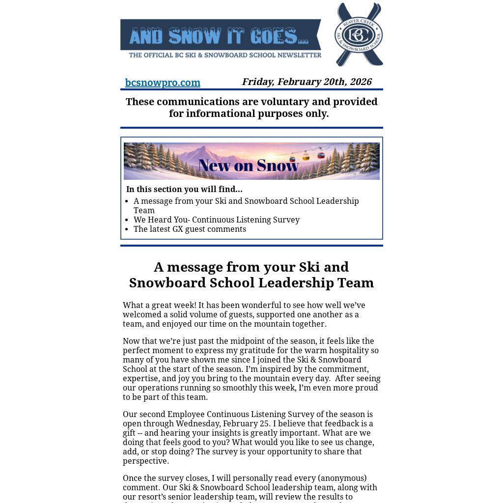 Once the survey closes, I will personally read every (anonymous) comment. Our Ski & Snowboard School leadership team, along with our resort’s senior leadership team, will review the results to determine where action is needed. Our company also evaluates results across all resorts to identify opportunities for action. I’ve seen countless meaningful changes—both big and small—come directly from this process, and I would love for each of you to take a few minutes to participate. Thank you.