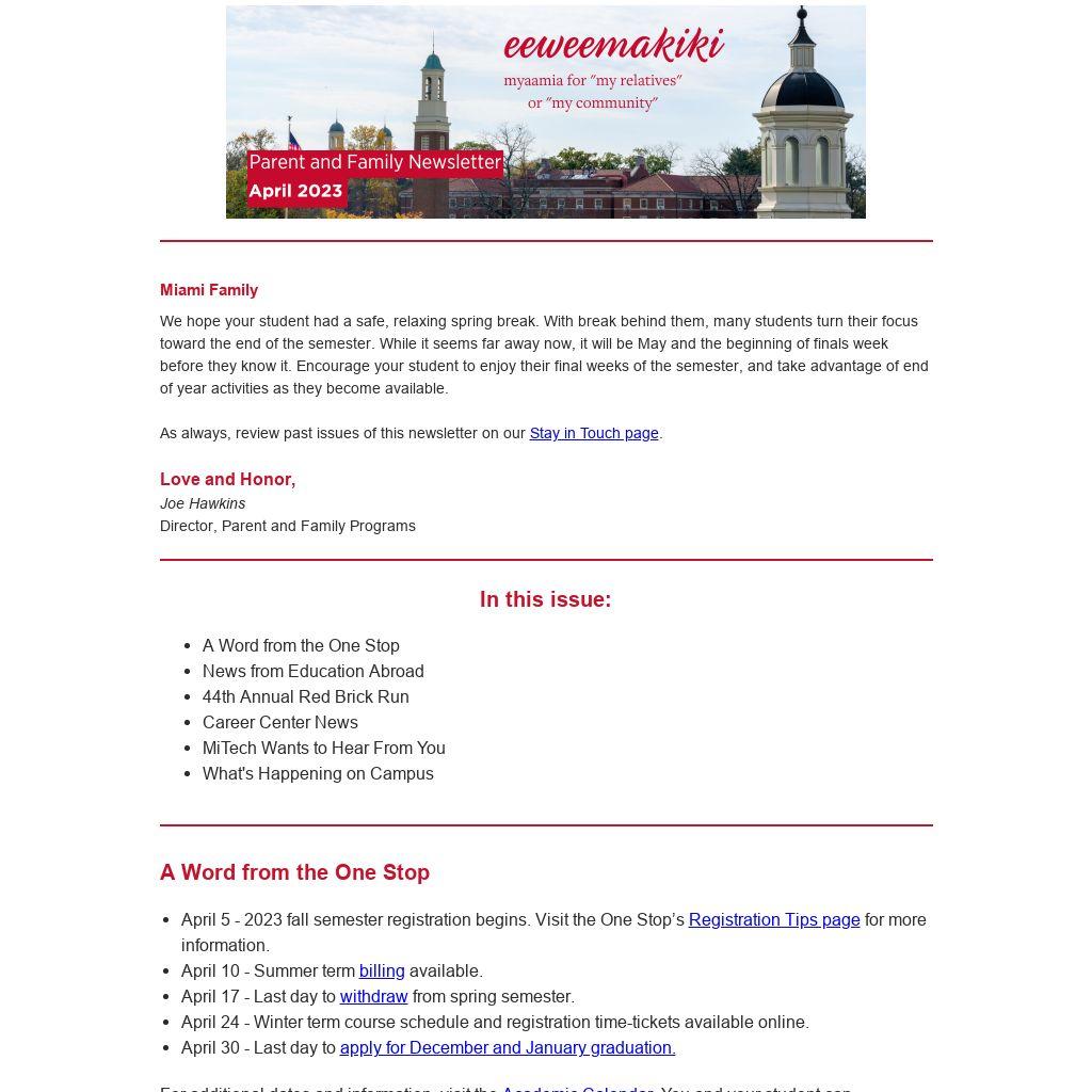 We hope your student had a safe, relaxing spring break. With break behind them, many students turn their focus toward the end of the semester. While it seems far away now, it will be May and the beginning of finals week before they know it. Encourage your student to enjoy their final weeks of the semester, and take advantage of end of year activities as they become available.