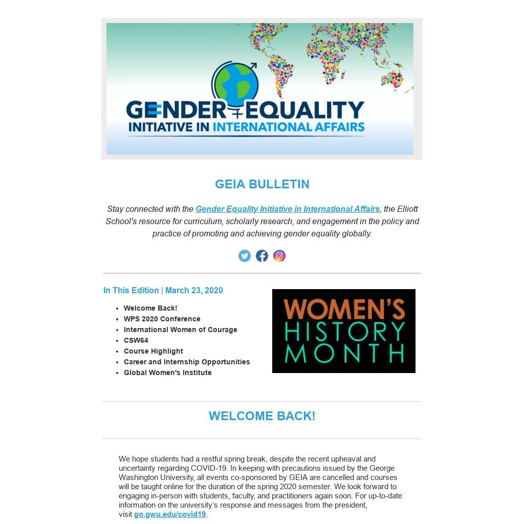 We hope students had a restful spring break, despite the recent upheaval and uncertainty regarding COVID-19. In keeping with precautions issued by the George Washington University, all events co-sponsored by GEIA are cancelled and courses will be taught online for the duration of the spring 2020 semester. We look forward to engaging in-person with students, faculty, and practitioners again soon. For up-to-date information on the university’s response and messages from the president, visit go.gwu.edu/covid19.