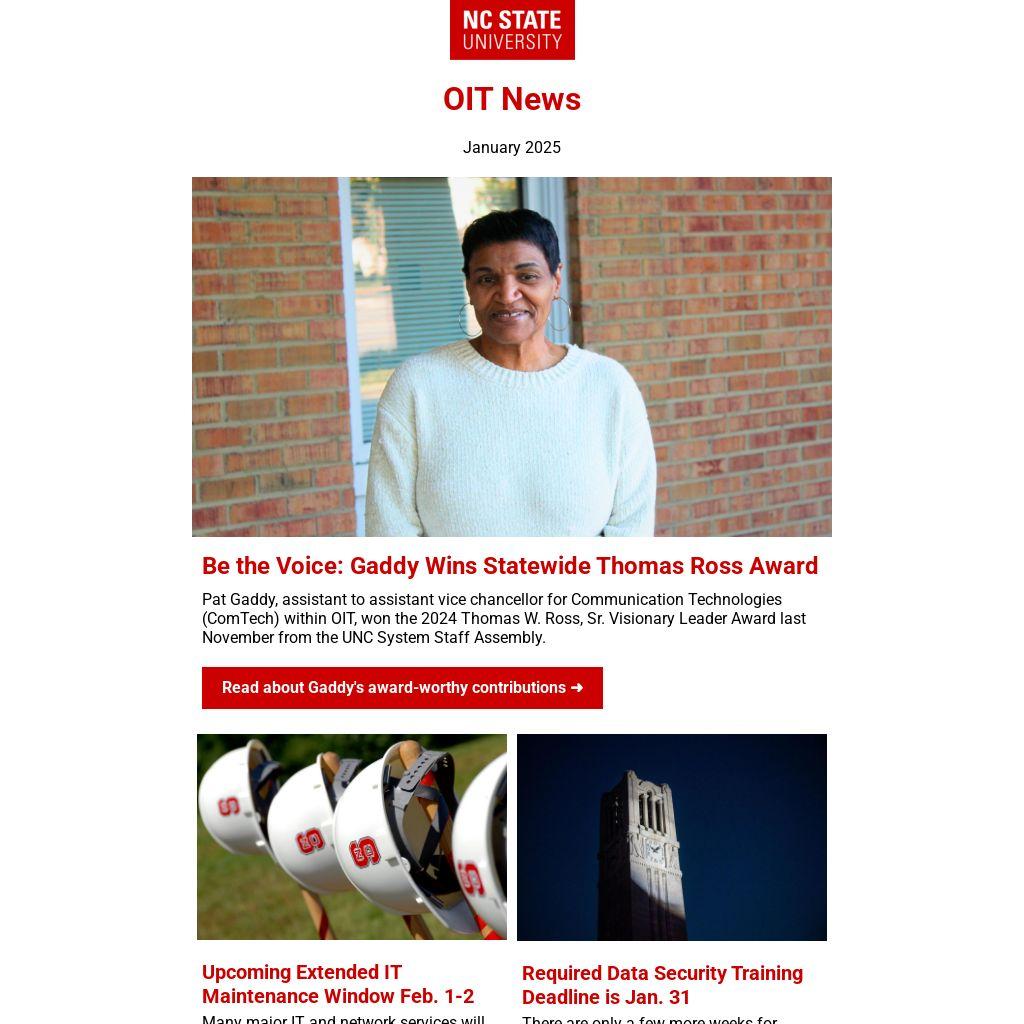 Pat Gaddy, assistant to assistant vice chancellor for Communication Technologies (ComTech) within OIT, won the 2024 Thomas W. Ross, Sr. Visionary Leader Award last November from the UNC System Staff Assembly.