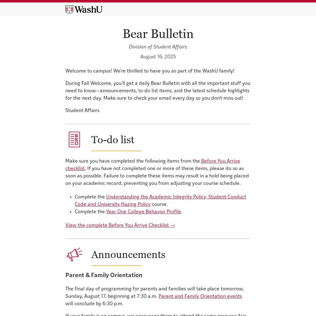 During Fall Welcome, you'll get a daily Bear Bulletin with all the important stuff you need to know—announcements, to-do list items, and the latest schedule highlights for the next day. Make sure to check your email every day so you don't miss out!
