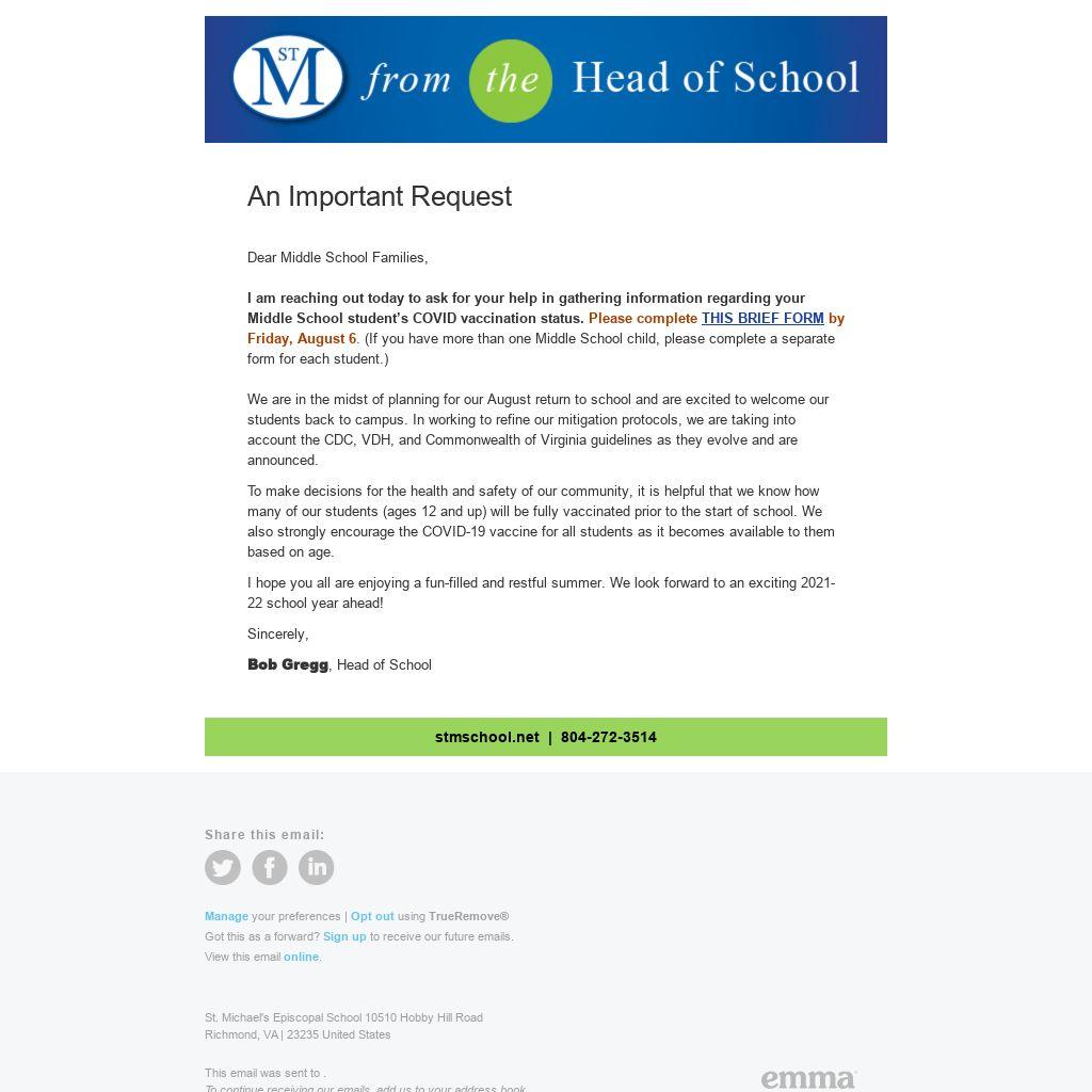 I am reaching out today to ask for your help in gathering information regarding your Middle School student’s COVID vaccination status. Please complete THIS BRIEF FORM by Friday, August 6. (If you have more than one Middle School child, please complete a separate form for each student.)